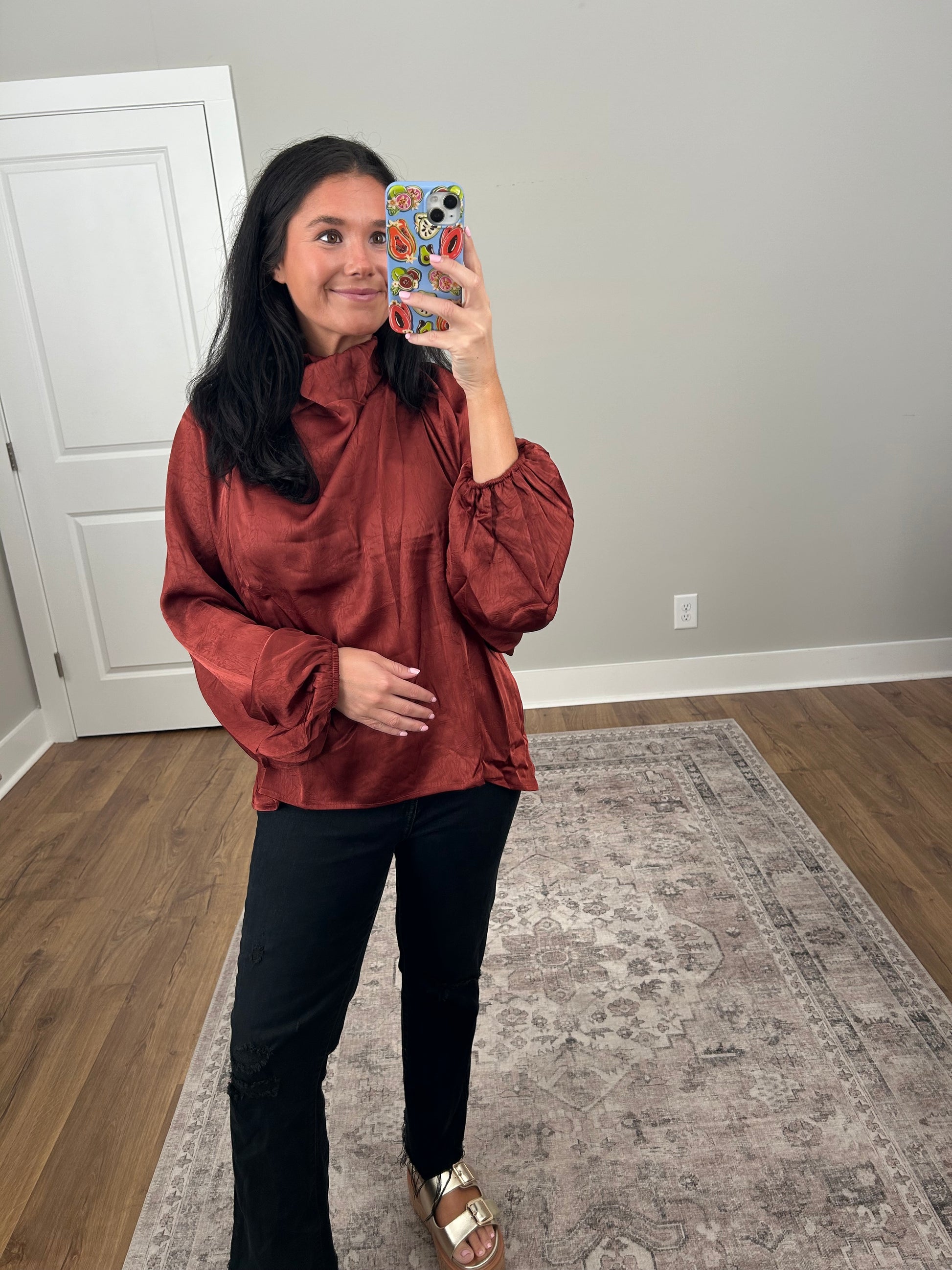 Elegant cognac satin silk long-sleeve top featuring a draped mock neckline and a sophisticated back keyhole with button closure. Lightweight and unlined, it offers a fluid, luxurious drape while maintaining effortless comfort. Perfect for layering under blazers or pairing with tailored trousers for a chic fall-to-winter look.