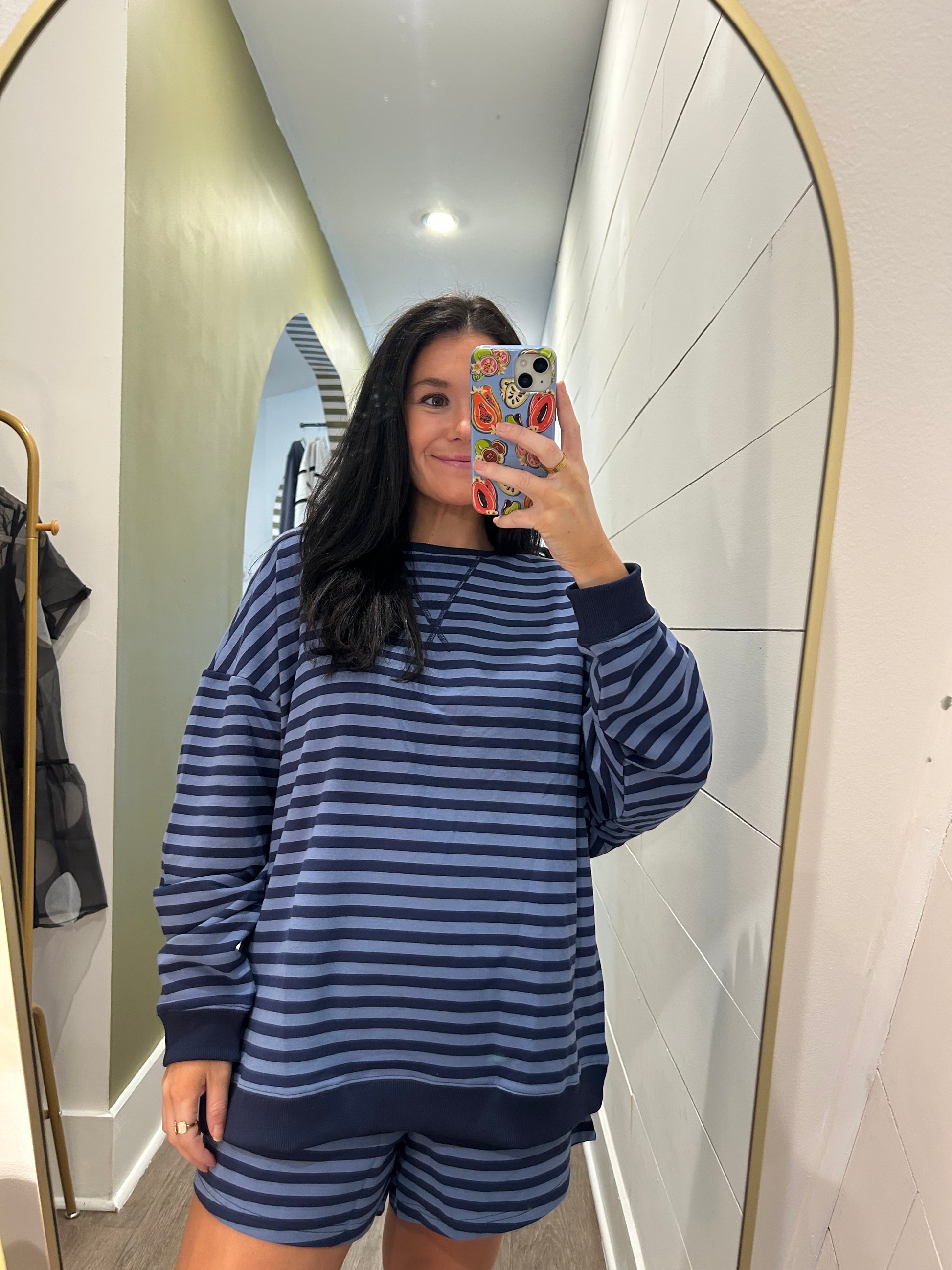Meet your new everyday favorite. This navy and light-blue two-tone set brings effortless comfort with a chic, modern vibe. The top features a slightly oversized fit for that relaxed, laid-back look, while the matching shorts keep it flattering and true to size. Side pockets add the perfect touch of practicality, whether you’re running errands or relaxing at home.