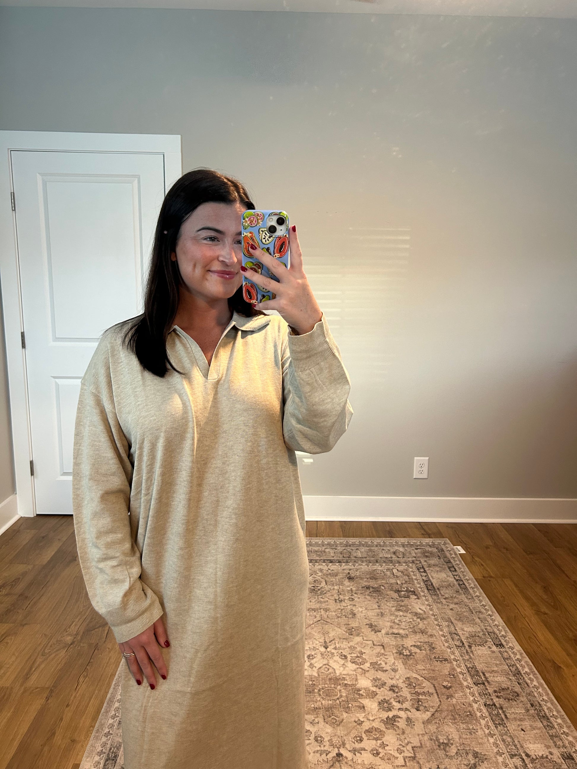 Soft, versatile, and timeless, the Emerson Dress is the perfect addition to your year-round wardrobe. Crafted in a natural, neutral tone, this lightweight sweater maxi dress features a flattering V-neck and a subtle collar for an elevated, polished look. Its relaxed yet refined silhouette makes it ideal for layering with boots or sneakers, transitioning effortlessly from casual days to cozy evenings.