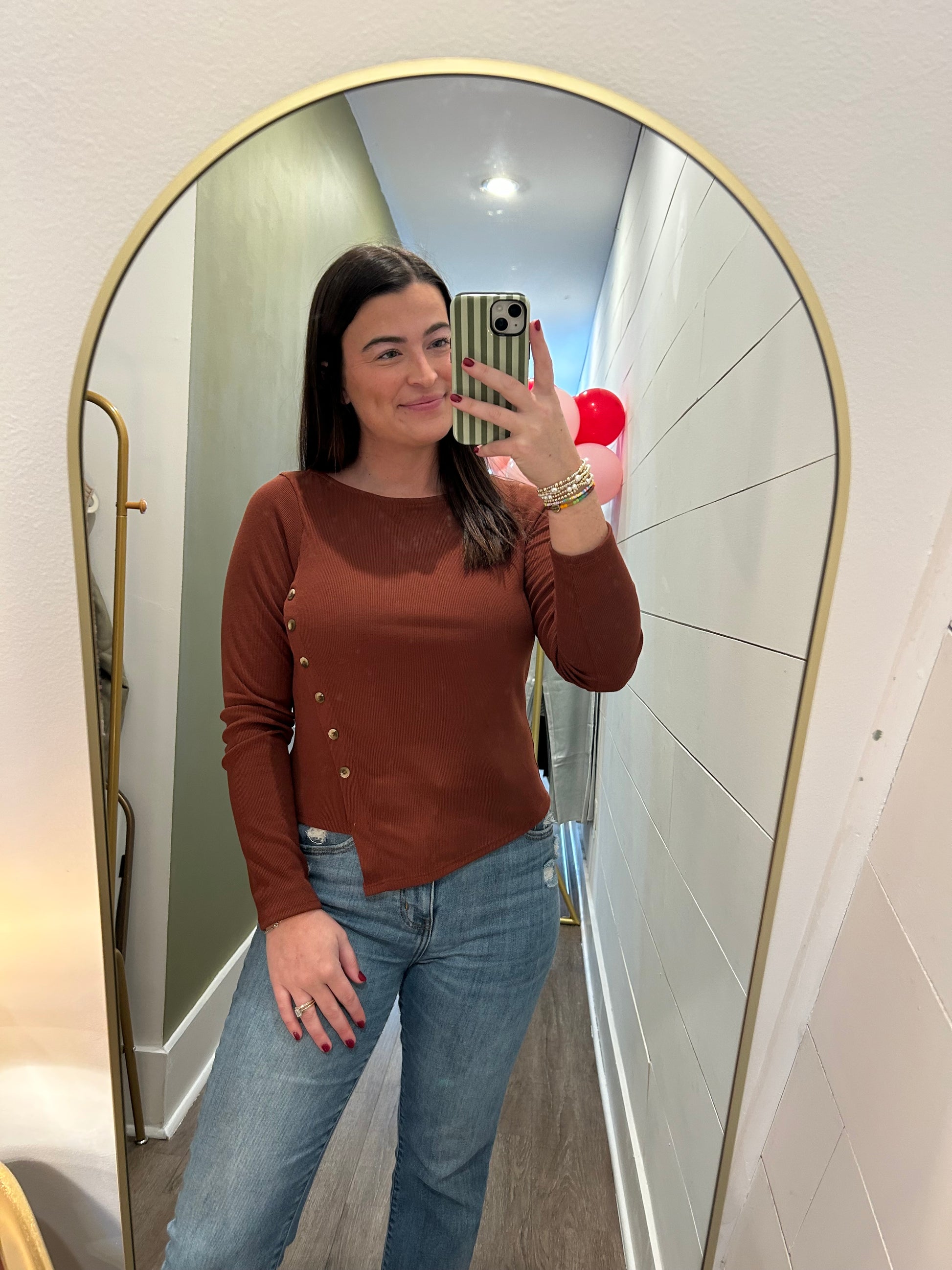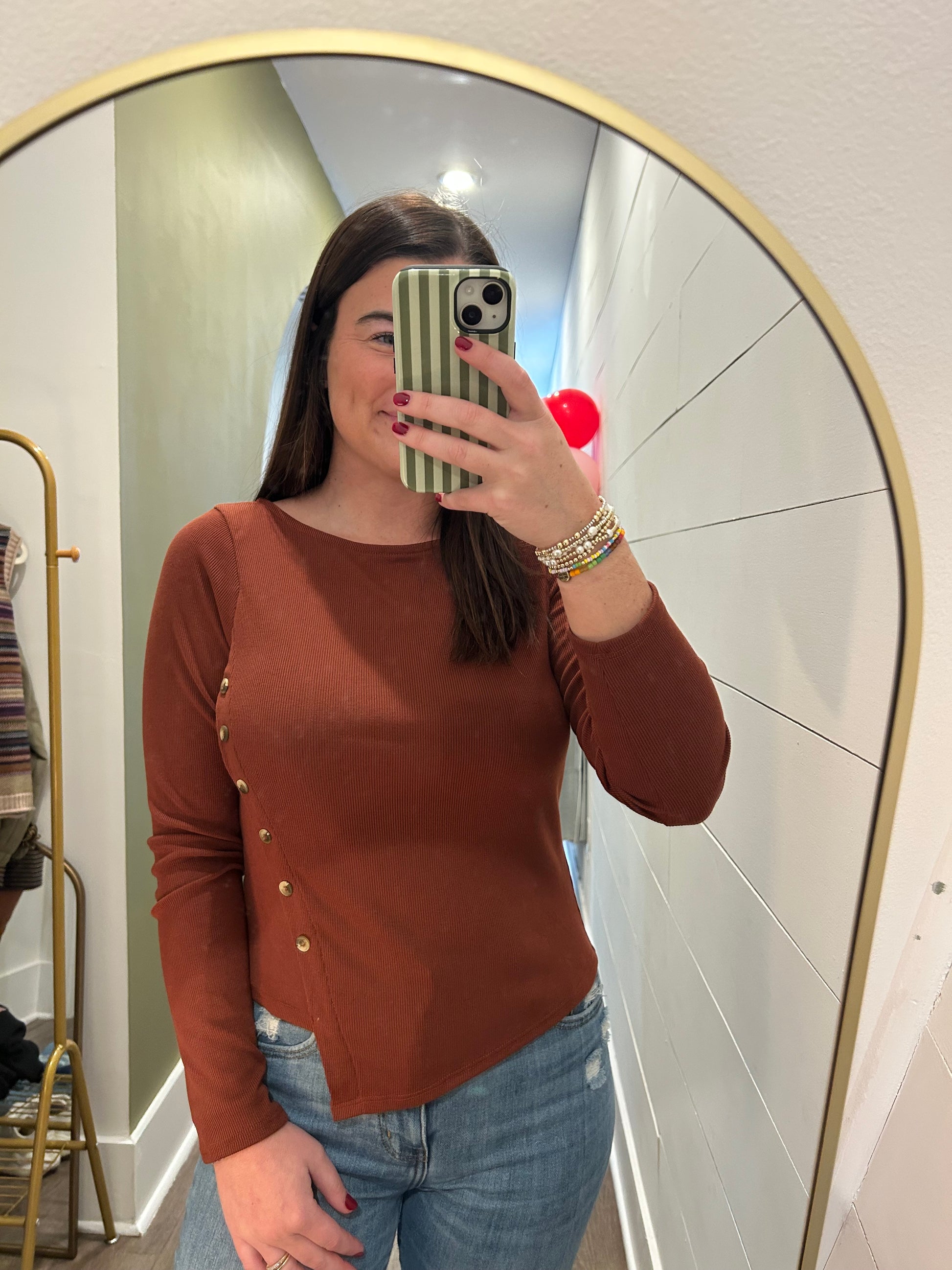 This ribbed rust-colored shirt is all about the details. Designed with a flattering asymmetrical hem and non-functional button accents for added style, it brings a modern, elevated edge to a classic silhouette. Soft, stretchy, and easy to dress up or down, this top is a standout piece for everyday wear.