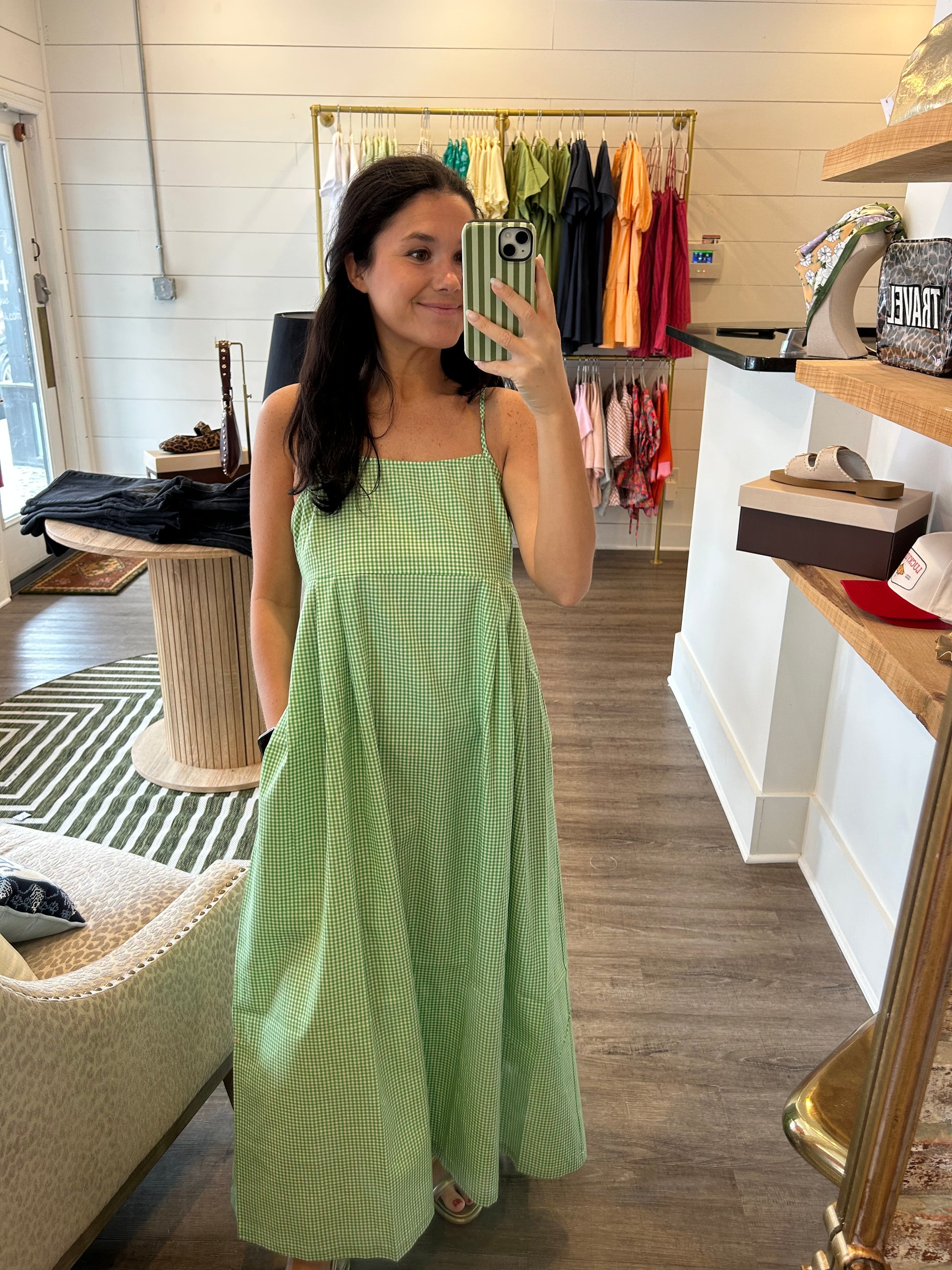 The ultimate summer staple! This adjustable strap tank dress comes in the prettiest green gingham print that feels fresh, feminine, and timeless. The smocked back gives you a comfortable, flexible fit while still keeping a flattering shape through the front. And yes — she has pockets! Dress it up with wedges or keep it casual with sneakers — either way, it’s an easy yes.