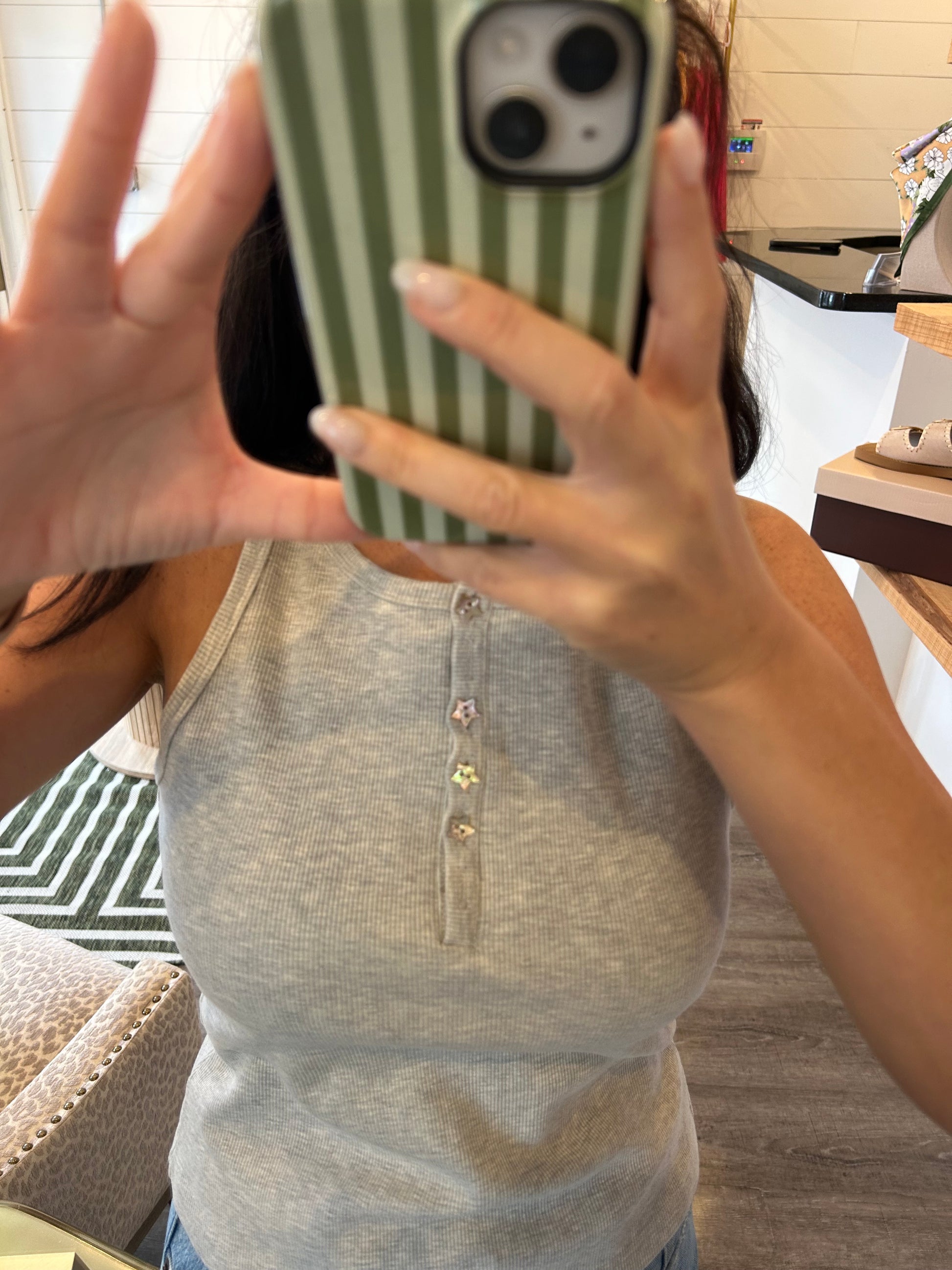 Your new everyday essential — but make it cute!! This thick, high-quality ribbed cotton tank features the sweetest beaded star buttons for a subtle touch of shine. The structured yet stretchy fabric gives a flattering, smoothing fit while still feeling soft and breathable. Designed with bra-friendly straps (no peek-through here) this versatile gray tank is perfect for layering or wearing solo. Dress it up with denim and gold jewelry or keep it casual with shorts and sneakers — she does it all.